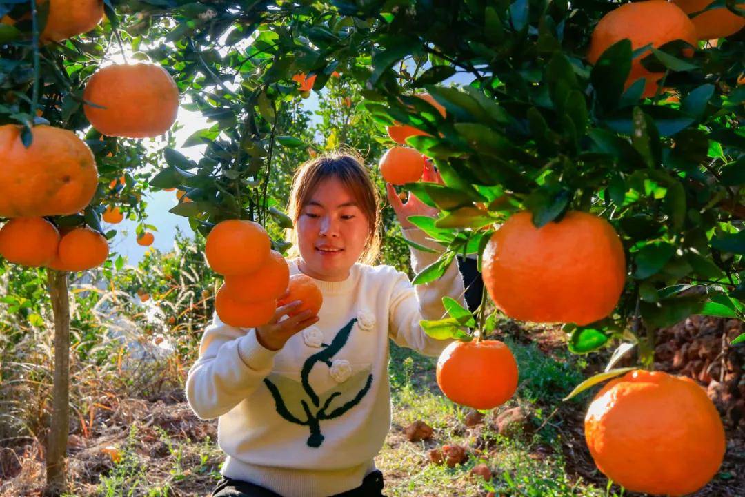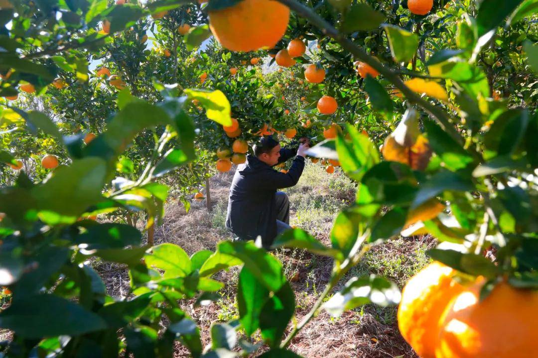 在基地的另一旁,种植大户陈贵山站在果树前,手疾眼快地采摘着金黄的橘子,脸上洋溢着丰收的喜悦。
